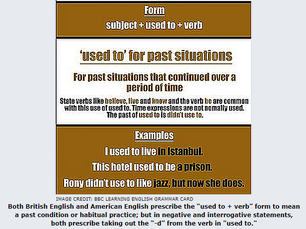 Since American English is the Philippine standard, however, we need to follow its prescriptions for the “used to + verb” form—but without necessarily turning a totally blind eye to the evident virtues of the contrary usage prescriptions when the form is used in negative and interrogative statements.